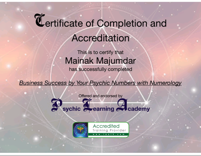 The above is a certification awarded by the Psychic Learning Academy, recognizing successful completion of advanced training in Business Success by Your Psychic Numbers with Numerology