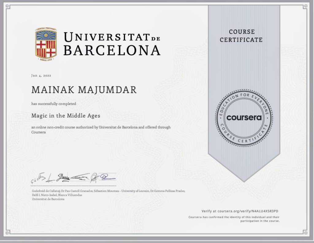 I completed the Course on ‘Magic In The Middle Ages’ from Universitat de Barcelona (University of Barcelona) Spain. My Grade after exams and assignments is 80.35%.